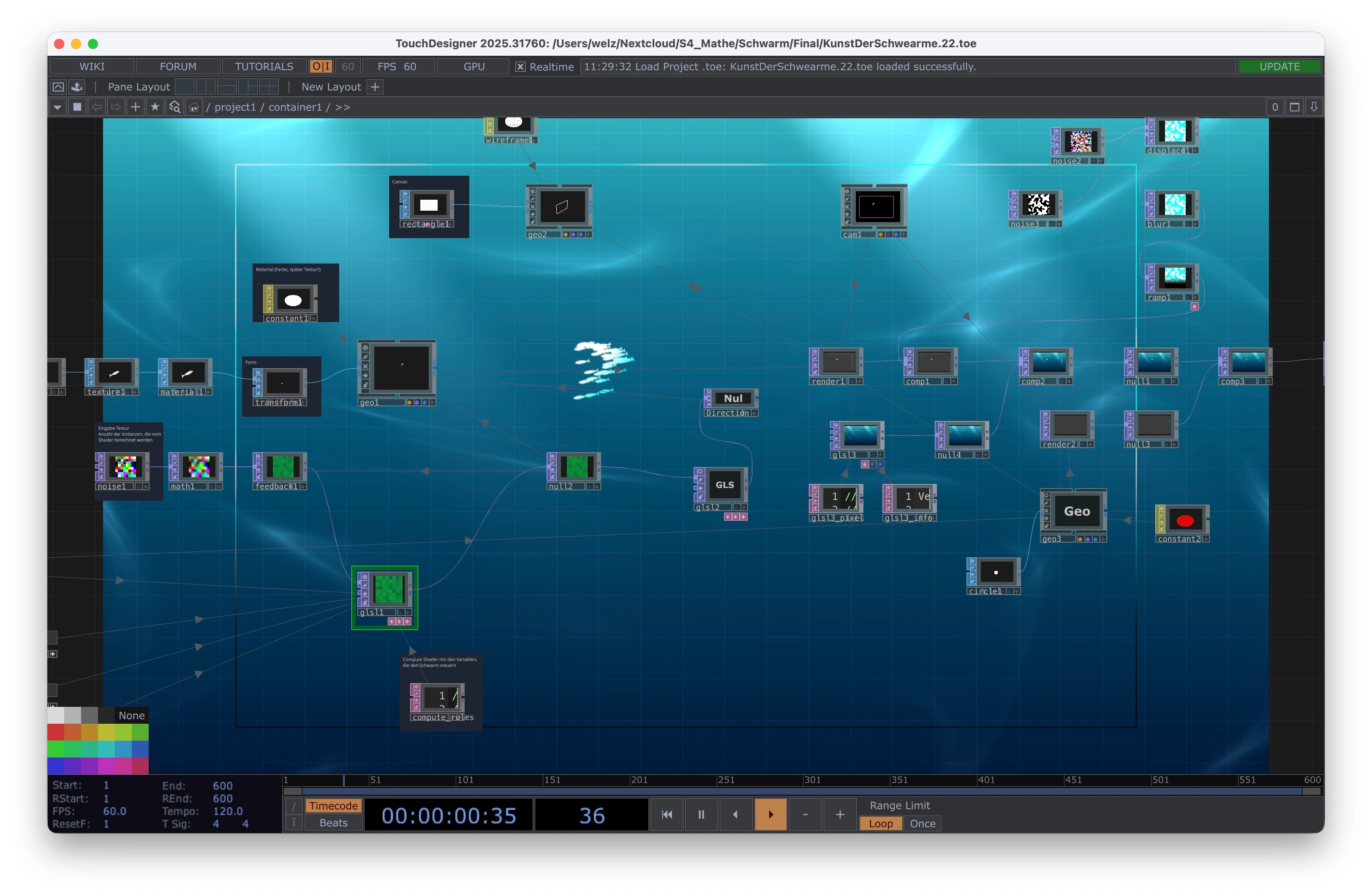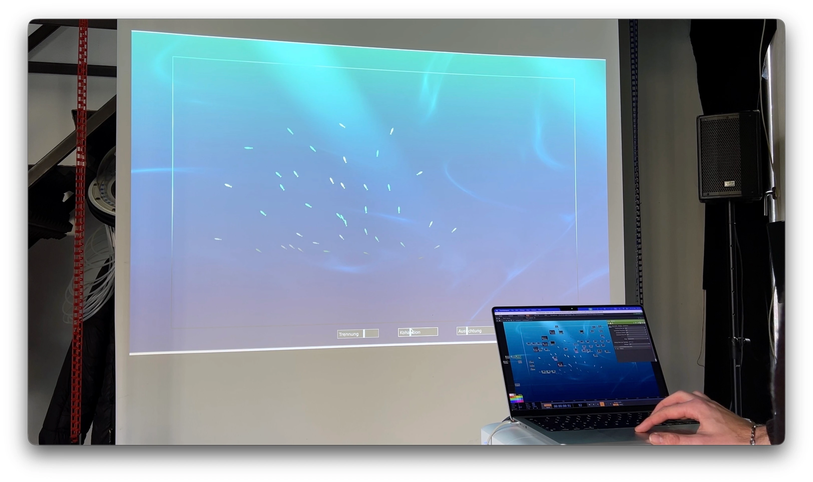 Die Kunst der Schwärme is a research project, exploring the mathematical simulation of flocks, accompanied by an interactive installation.