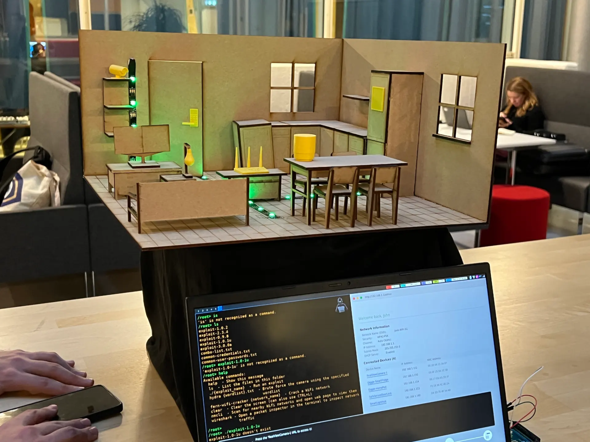 Invisible Intruder is an interactive exhibition prototype, visualizing data flow and cybersecurity risks of smart home devices.